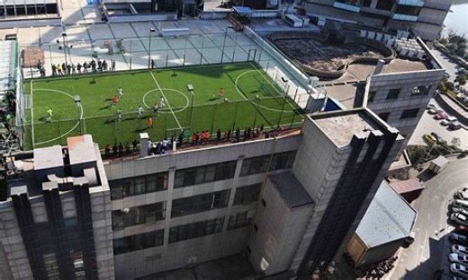 Dachnutzung Sportplatz, Beispiel Fussballfeld auf dem Dach eines Einkaufzentrums im Osten von China
