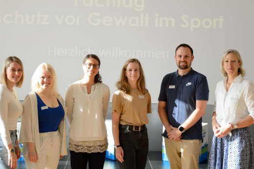 v.l. Pia Wilke (Geschaeftsfuehrerin HSJ), HSJ-Vorstandsmitglied Antonia Vellguth (Sport-, Kinder- und Jugendpolitik), Dr. Caroline Bechtel (Deutsche Sporthochschule Koeln), Juliane Boetel (1. Vorsitzende HSJ), Daniel Knoblich (Vorstandsvorsitzender Hamburger Sportbund, HSB), Michaela Roehrbein (Vorstand Sportentwicklung DOSB)