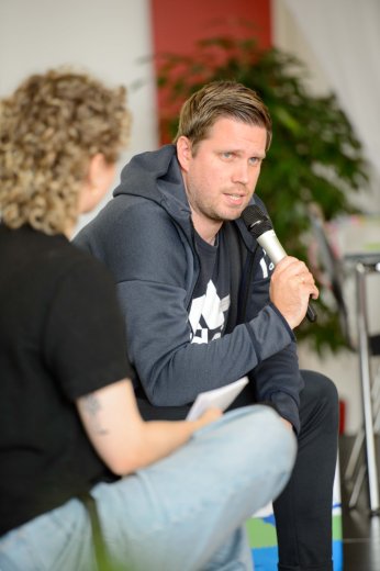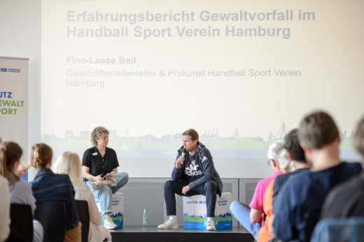 v.l. Luca Kit Larsen (HSJ, Coach, Mediatorin, Soziologin und Referentin zu Praevention sexualisierter Gewalt), Finn-Lasse Beil (Geschaeftsstellenleiter & Prokturist Handball Sport Verein Hamburg)