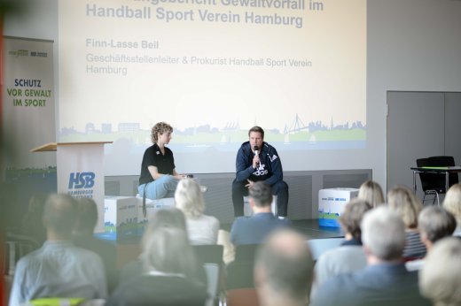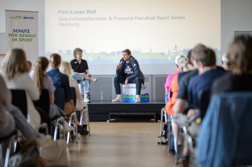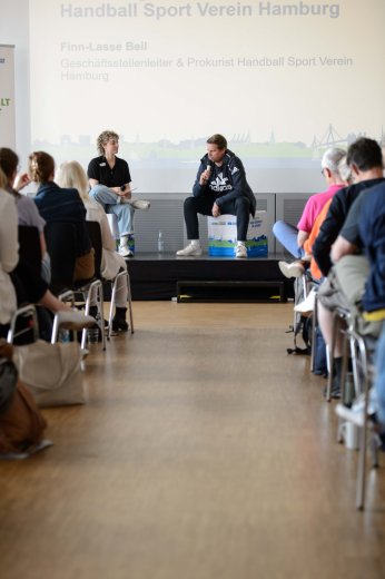 v.l. Luca Kit Larsen (HSJ, Coach, Mediatorin, Soziologin und Referentin zu Praevention sexualisierter Gewalt), Finn-Lasse Beil (Geschaeftsstellenleiter & Prokturist Handball Sport Verein Hamburg)
