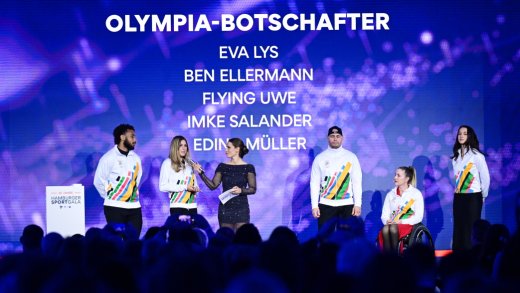 Praesentation Olympia-Botschafterinnen und -Botschafter, v.l. Ben Ellermann (Rugby), Imke Salander (Hyrox), Moderatorin Christina Rann, Uwe Schueder ''Flying Uwe'', Edina Mueller (Para-Rudern), Eva Lys (Tennis)