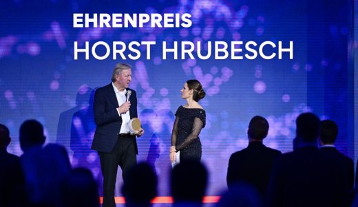 Ehrung Ehrenpreis, v.l. Gewinner Horst Hrubesch, Moderatorin Christina Rann