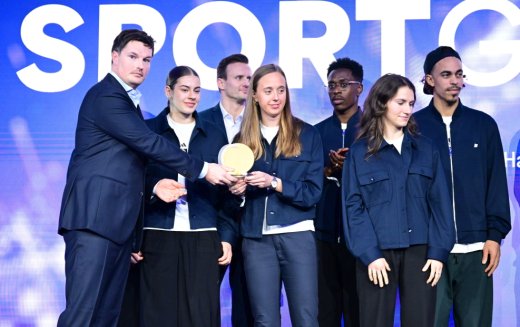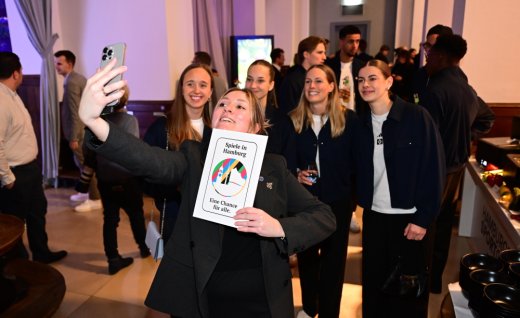 Praesentation Olympia-Botschafterinnen und -Botschafter, Selfie mit Moderatorin Christina Rann, Ben Ellermann (Rugby), Imke Salander (Hyrox), Uwe Schueder ''Flying Uwe'', Edina Mueller (Para-Rudern), Eva Lys (Tennis)