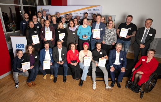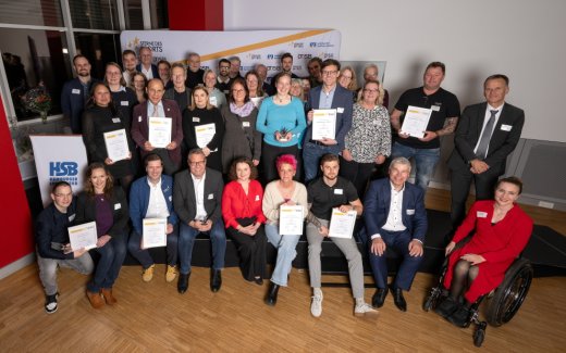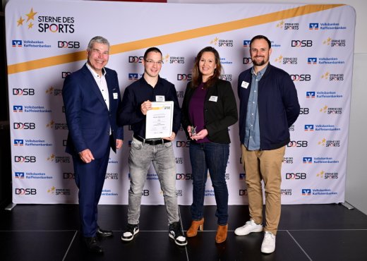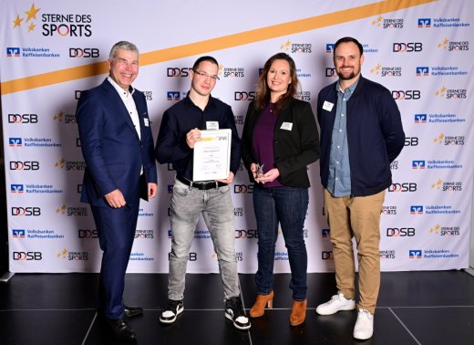 3. Platz Atrium Sports e.V. v.l. Philipp Maschmann (Leiter Marketing der VReG), Leon Schneider, Vanessa Hoppe (Atrium), Daniel Knoblich (Vorstandsvorsitzender HSB)